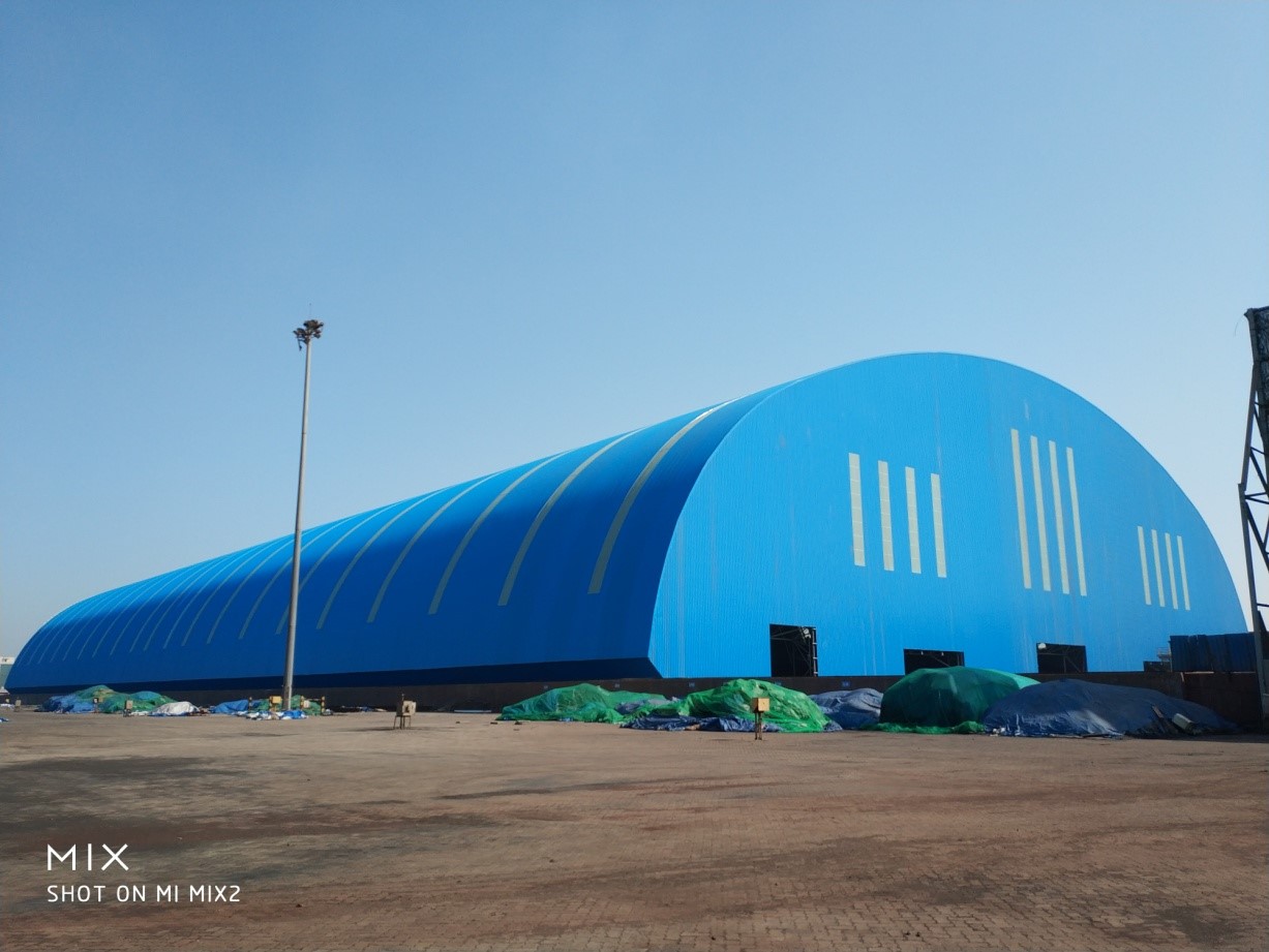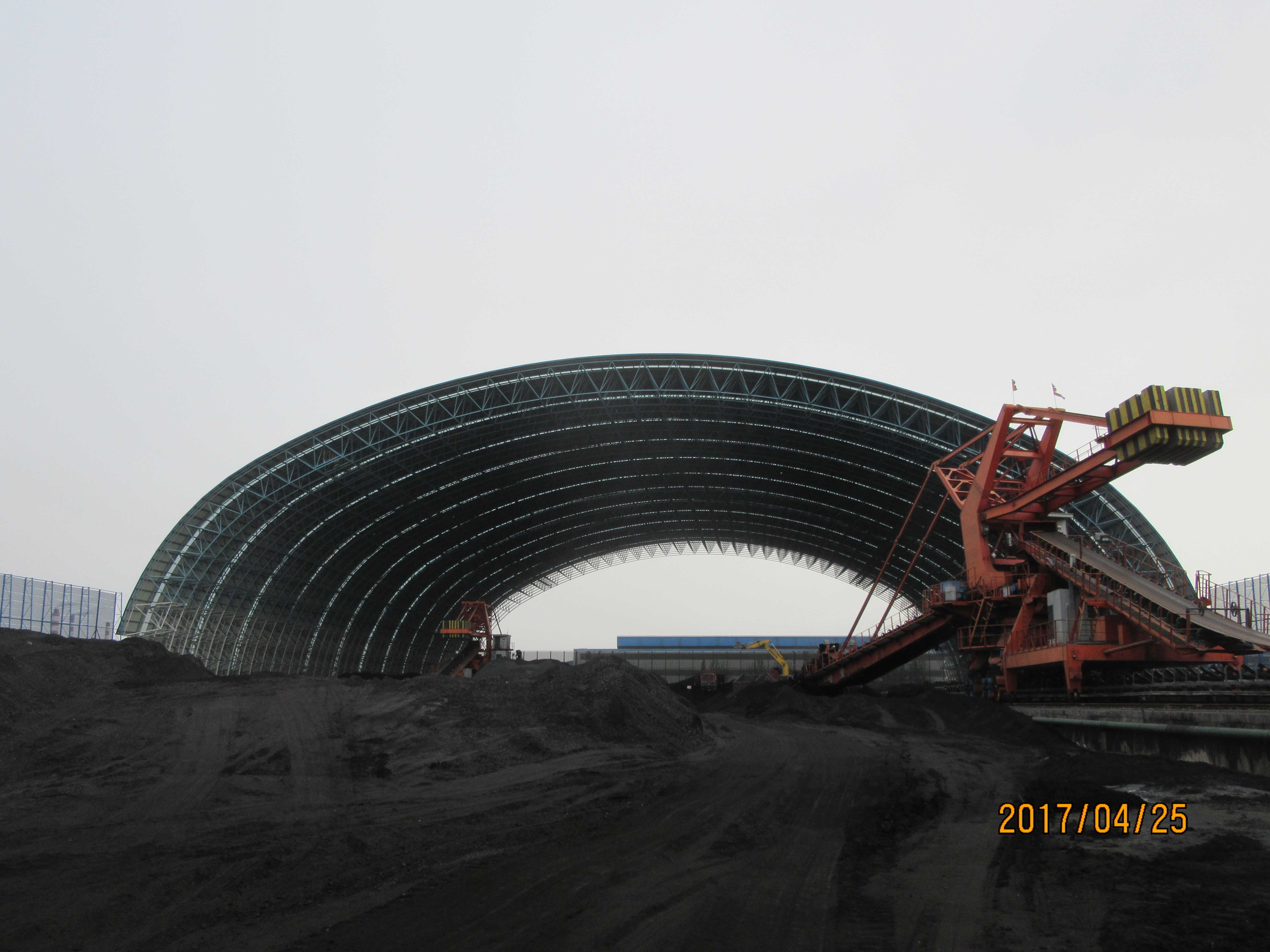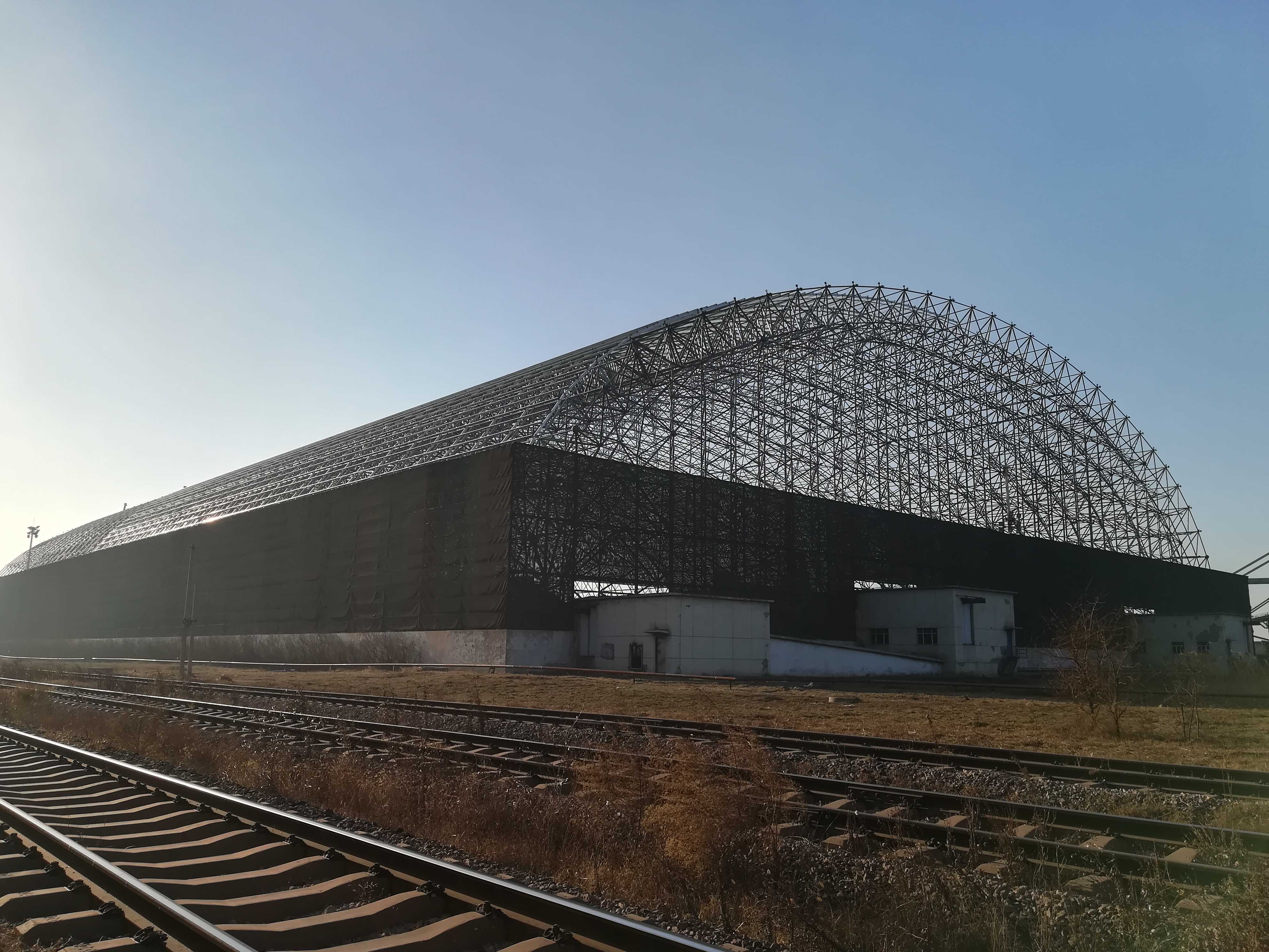 首鋼京唐能源部煤料場封閉 長度290m,跨度145m,網殼矢高高44.486m,目前正在施工。