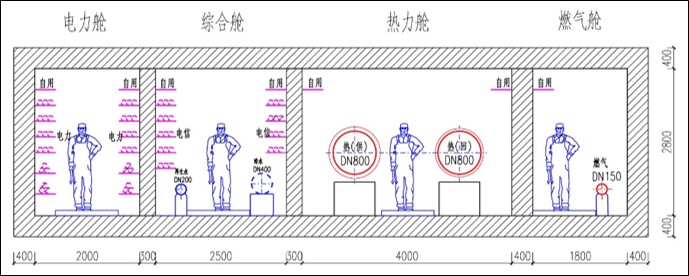 規劃建設綜合管廊長度28公里,綜合管廊斷面尺寸分別為:雙艙6.2m*3.6m,三艙室8.9m*3.5m,容納供水、再生水、熱力、電力線纜、電信管道、燃氣等市政管線。